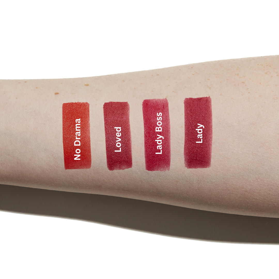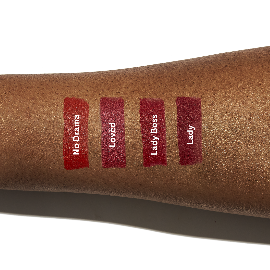 This flattering orange/red is a great color for fall. Don’t be afraid of orange, it looks so good on a variety of skin hues. She's bold but she has NO DRAMA!